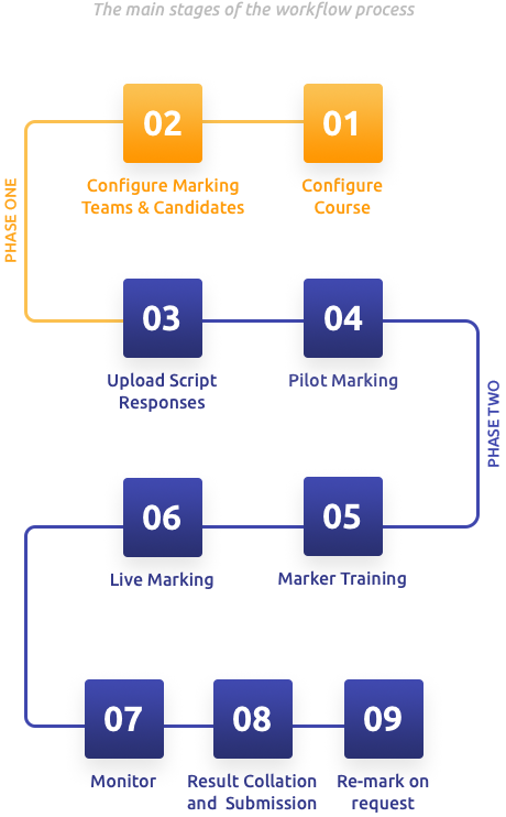 Marking of each course within MarkManager is an independent exercise. For any given course the marking process has two main phases, the first preparatory and the second beginning as soon as an online test is completed, or once examination scripts are collected and assembled from exam centres.